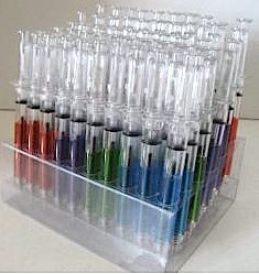 These retractable ball point syringe pens are shaped like a hypodermic needle and come with a colored liquid inside the body of the pen (liquid is harmless). Each pen measures approximately 5 1/2" in length. Assorted Colors. May write in black or blue ink.B000NK9BOSASIN