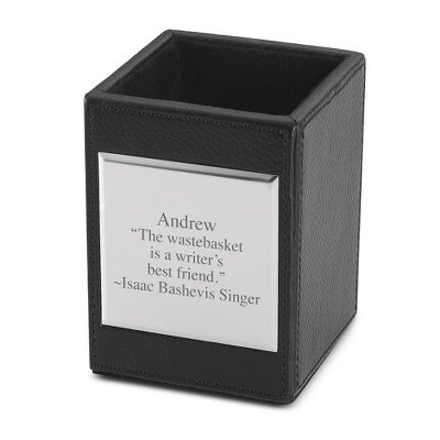 A place for everything and everything in its place. Help them live this motto, while adding a splash of sophistication to their workspace with this pen cup from our Pebble Grain Collection. With its chic black pebble grain set off by a silver engraving area for their name or your words of wisdom, organization has never looked so impressive. - Perfect for new jobs, promotions (spruce up their new office!), or even kick up the home office a notch - Pair it with our other Pebble Grain pieces, like the matching card holder Engraved Gift.B0079XWF5EASIN