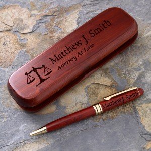 Our new, finely crafted Rosewood Writing instruments are the perfect gifts for the legal professional! Skillfully custom engraved with their full name, and any single line message, title, firm, etc. of your choice underneath. You also choose the Scales of Justice or Gavel graphic design artistically engraved into the rosewood box creating a sophisticated and memorable keepsake for him or her. The quality crafted rosewood Pen Set is handsomely completed with a matching solid wood case for convenient storage and sophisticated gift presentation.Pen features twist action ballpoint operation. Refills for the pen can be found at any office supply store. Look for Cross® brand ballpoint style refill.An unique gift for birthdays, graduations, retirement, and corporate gifts.B000XQG2A8ASIN