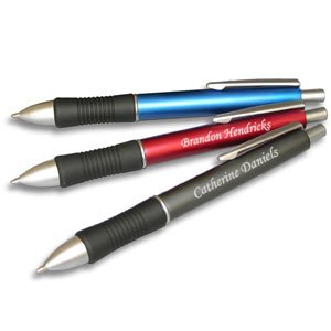 Enjoy every writing task with this attractive, executive pen. It takes refills and has black ink in its ballpoint. This affordable metal pen is very durable and lightweight! The impressive design features clip, mid ring and tip in contemporary satin chrome finish and comes equipped with an ergonomic cushion grip for a comfortable writing experience. It operates with a click-action mechanism. It also makes a stunning gift for a hard-working business person on your gift list. Pen comes packaged in a black velvet pouch for presentation. Add an extra touch of sophistication to your exclusive personalized pen with our professional engraving services. Your personalized pen can be engraved for FREE with 1 line. Colors: Silver, Blue, Red Refills for the pen can be found at any office supply store. Measures 5 1/2" L Fast Turnaround: 1-2 business days for personalization, before shipping. Save 10% on all gifts by entering promo code AMZ615 when checking out.B0025MK8USASIN
