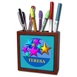 SmudgeArt Female Child Name Designs - Vibrant colored stars on a blue background personalized with the name TERESA - Tile Pen Holders-5 inch tile pen holder Review