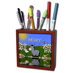 Decorative donkey and bird art design for children - personalized with the name Henry Tile Pen Holder is measuring 5w x 5h x 2d. Made from high quality solid mahogany wood with satin finish and one 4.25 commercial grade mirror gloss ceramic tile. Looks great on a desk or counter top with a full color custom imaged tile.B00846U5V6ASIN