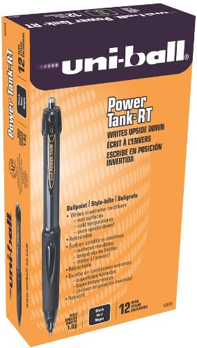 Writes on wet paper, upside-down, in temperatures down to -20 °C, and even in zero-gravity, fulfilling all your writing needs wherever you may be! Pressurized ink tube allows it to write smoothly in extreme conditions. Features Uni-Super Ink that helps prevent against check and document fraud. Textured rubber grip provides extra comfort and control. Semi-transparent barrel lets you monitor the ink supply. Retractable to protect pockets and purses. Special Ink Type: N/A; Pen Style: Retractable; Ink Color(s): Black; Pen Type: Ballpoint.uni-ball Power Tank RT Ballpoint Retractable Pen, Bold, Black Ink, Dozen (42070) Feature
