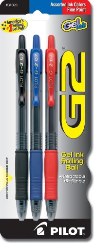 Discover writing perfection with G2. America's No.1 selling Gel Ink Pen according to ACNielsen! Retractable, refillable and with a contoured rubber grip for writing comfort. Experience the dynamic gel ink formula that's smooth writing and smear proof. Available in Black, Blue and Red inks, and Ultra Fine, Extra Fine, Fine and Bold Point sizes.Pilot G2 Gel Ink Roller Ball Pens, 3-Pack, Red, Blue, Black Ink (31023) Feature